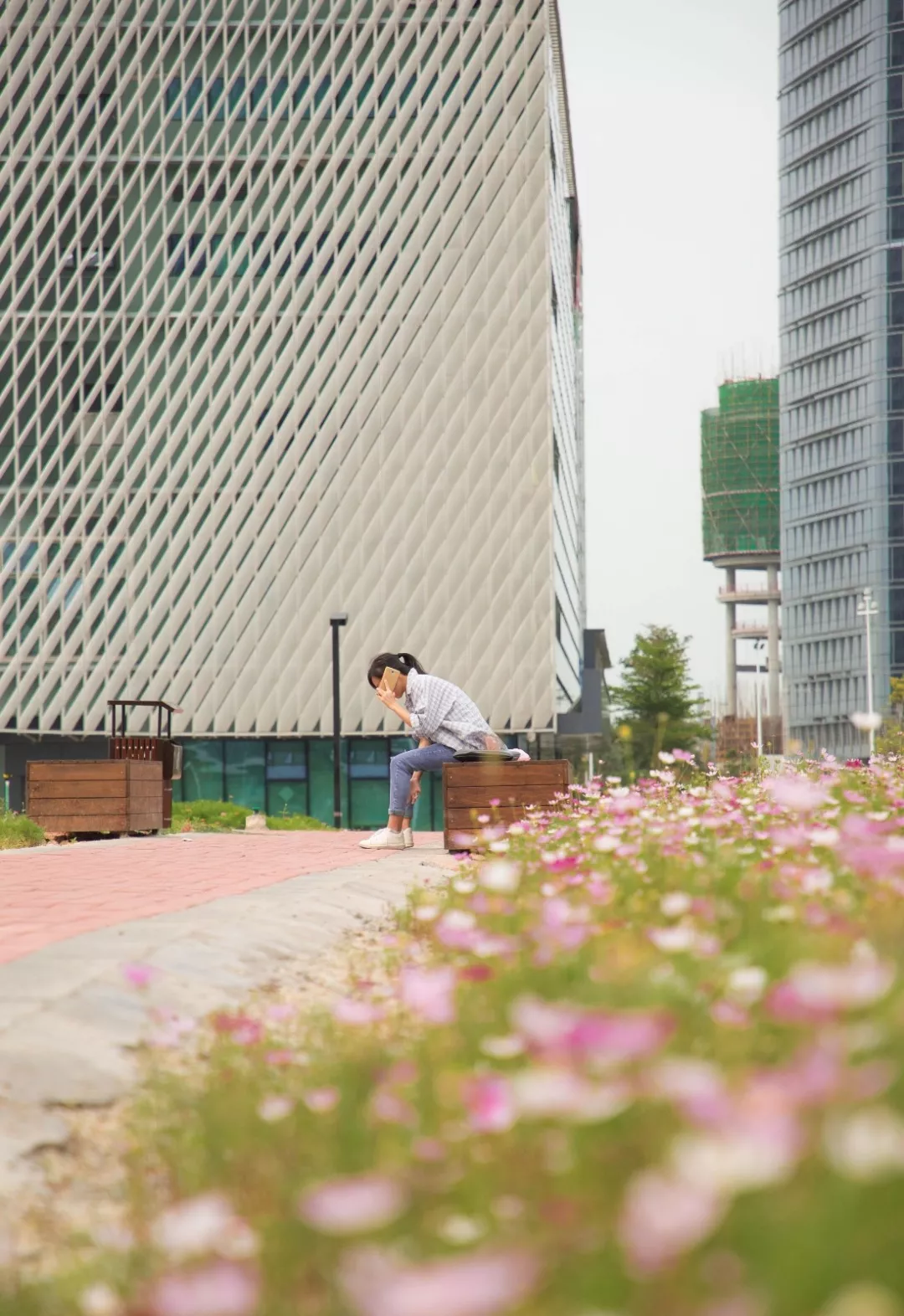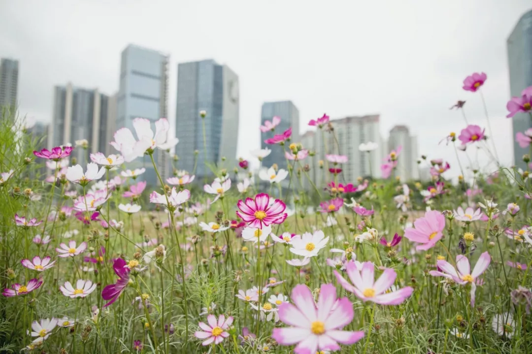 從寶安圖書館步行數(shù)十步,便是一大片浪漫的花海。風從不遠處的海面吹來,那些隨風起舞的白色、黃色、紫色、紅色、粉色的小花,就是秋英。