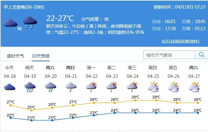 據(jù)深圳天氣,18-20日深圳將迎來新一輪暴雨過程:18日陰天轉(zhuǎn)小到中雨局部大雨伴有短時雷暴,氣溫22-27℃,19-20日有中到大雨局部暴雨并伴有雷暴和短時大風(fēng);21日降雨減弱;22-23日有短時陣雨,部分時間可見陽光。