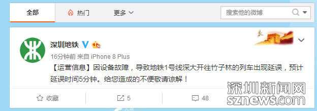 這周的星期一,深圳地鐵1號(hào)線深大開(kāi)往竹子林列車延誤