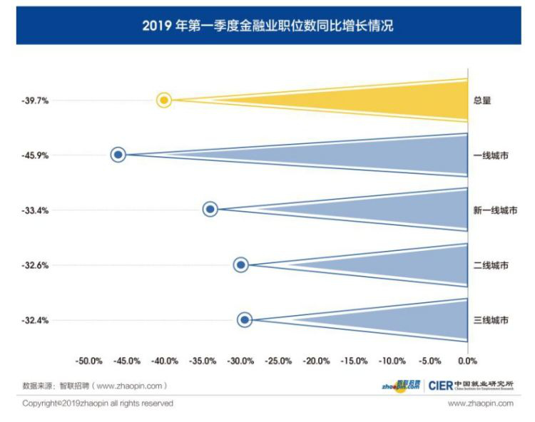 此外,調(diào)研顯示,備受矚目且高薪的金融行業(yè)本季度就業(yè)狀況并未隨著股市的回暖同步好轉(zhuǎn)。根據(jù)智聯(lián)招聘大數(shù)據(jù),金融業(yè)2019年一季度的招聘職位數(shù)降幅在所有行業(yè)中最高,達39.7%。其中一線城市金融行業(yè)職位數(shù)的降幅最大,為45.9%,新一線、二線和三線城市的降幅均在33%左右。2017年以來,強化監(jiān)管成為金融領(lǐng)域的主基調(diào),在去杠桿、防風(fēng)險的同時,金融行業(yè)發(fā)展速度有所放緩,向市場提供的就業(yè)機會也整體下降,這在互聯(lián)網(wǎng)金融等新興業(yè)態(tài)主要活躍的一線城市表現(xiàn)更為明顯。