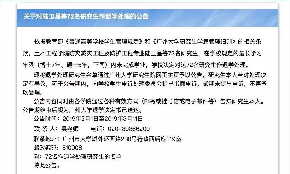 72名研究生在學(xué)校規(guī)定的最長(zhǎng)學(xué)習(xí)年限(博士7年、碩士5年,下同)內(nèi)未完成學(xué)業(yè),學(xué)校決定對(duì)這72名研究生作退學(xué)處理。