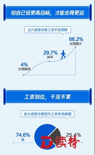 報告顯示,受經(jīng)濟環(huán)境等因素影響,過六成受訪者工資不及預期,同時,工資水平影響了職場人的職業(yè)規(guī)劃,逾七成受訪者因為工資考慮跳槽;66.2%的受訪者工資水平比預期少,只有4%的受訪者認為工資比預期多,此外,逾七成受訪者認為工資是考慮跳槽的主要因素。