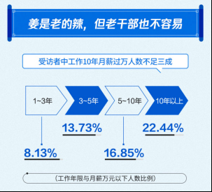 此外,受訪者月薪過萬人數(shù)與隨著工作年限遞增,但工作10年月薪高于1萬的人數(shù)依然不足三成。報告顯示,工作10年以上的受訪者中月薪過萬人數(shù)比例為22.44%、工作5-10年月薪過萬人數(shù)比例為16.85%、工作3-5年月薪過萬人數(shù)比例為13.73%、而工作1-3年月薪過萬人數(shù)比例是8.13%。這也從側面說明了工作經(jīng)驗不是影響工資水平的唯一因素,想要得到高薪,經(jīng)濟環(huán)境、工作地域、從事行業(yè)等因素也至關重要。