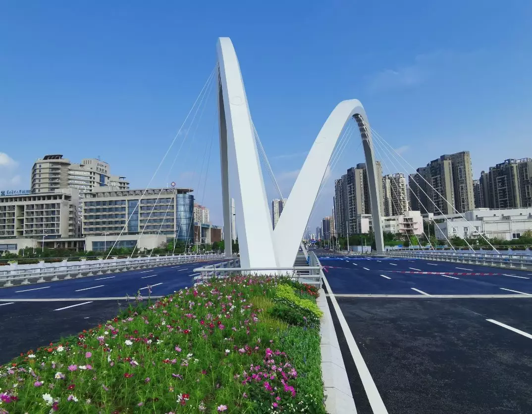 11號景觀橋以“融合”為主題,將流暢的線條融入景觀橋梁中,兩幅高低拱的線條無限延伸,猶如行云流水般瀟灑寫意,一氣呵成;同時,匯聚為一體的主拱又形成了“門”的形象符號,迎接著八方來客。