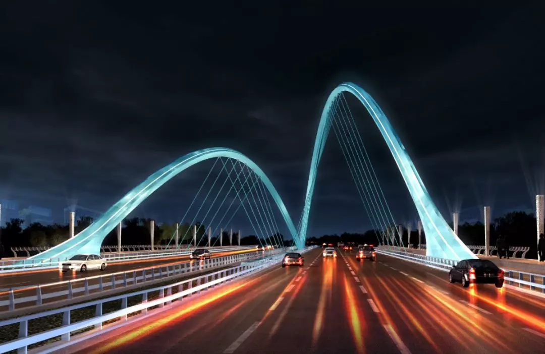 橋梁結(jié)構(gòu)形式采用下承式拱橋,兩幅高低拱空間交叉,形態(tài)優(yōu)美。橋梁周邊環(huán)境較為舒朗,橋梁設計體現(xiàn)豎向視覺沖擊力,體現(xiàn)地標性,使橋梁具有支配環(huán)境和成為景觀主題因素。