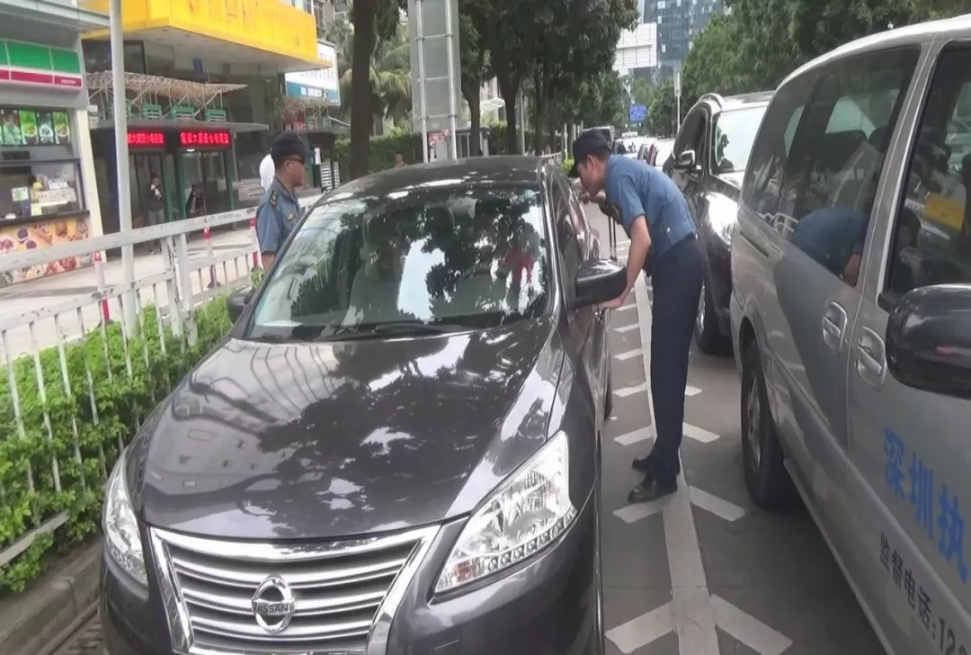 執(zhí)法人員例行對(duì)車(chē)牌號(hào)為粵BT***的小轎車(chē)進(jìn)行檢查,司機(jī)將車(chē)窗降下,緩緩駛?cè)氪龣z區(qū)域。