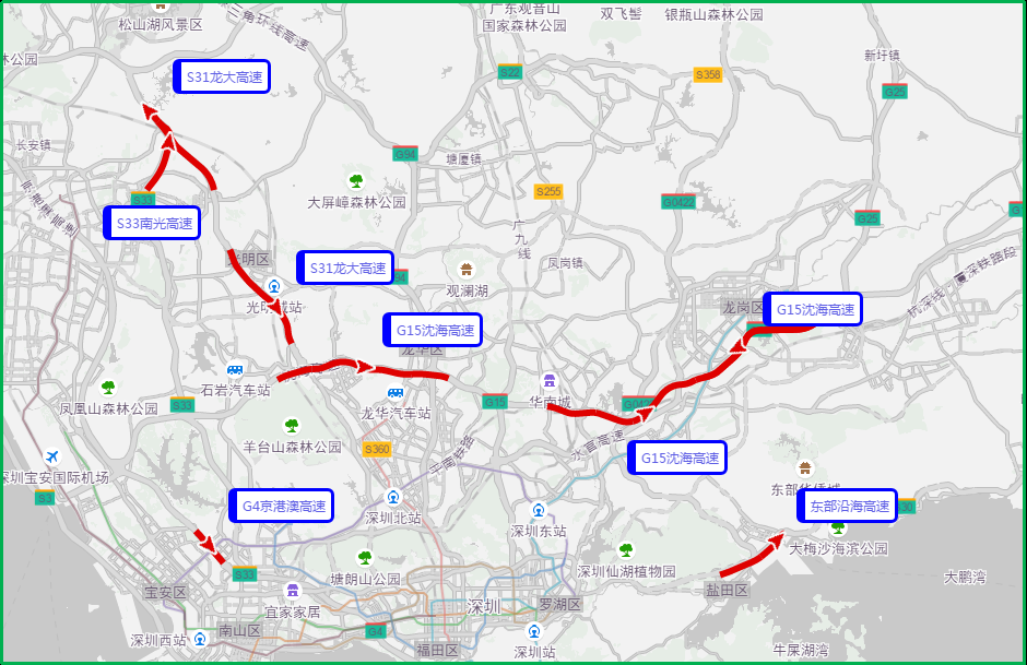 高德地圖交通大數據預測,五一期間深圳出行最容易擁堵緩行的5條高速分別是G15沈海高速、S31龍大高速、S33南光高速、東部沿海高速、G4京港澳高速等高速部分路段。