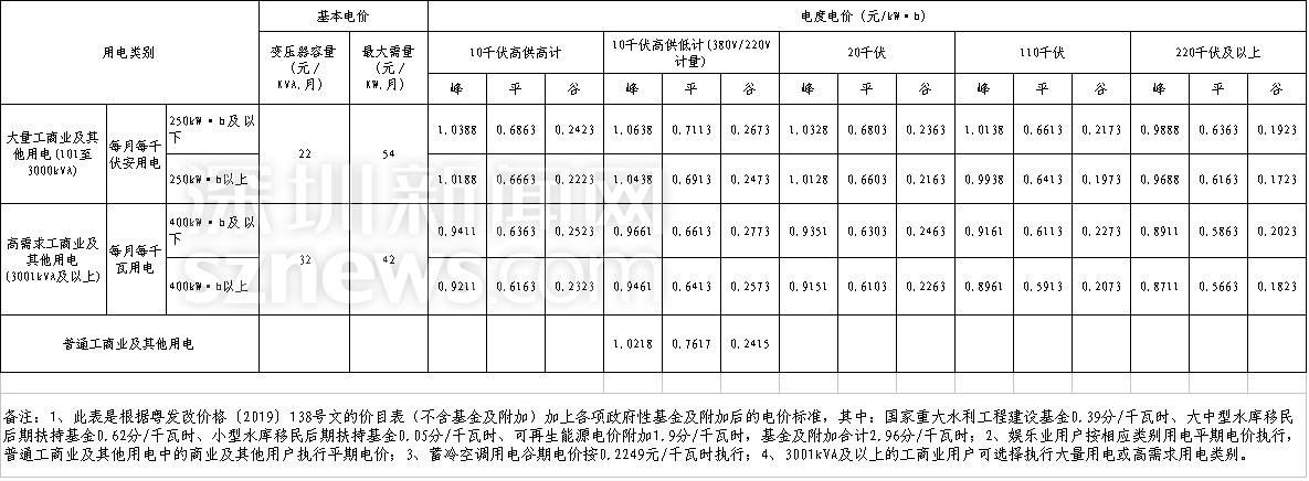 據(jù)悉,深圳市各類(lèi)工商業(yè)及其他用電的電度電價(jià)及其輸配電價(jià)均每千瓦時(shí)統(tǒng)一降低0.44分(含稅),此規(guī)定自2019年4月1日起執(zhí)行,即2019年4月1日起的實(shí)際用電統(tǒng)一按調(diào)整后的電價(jià)執(zhí)行。