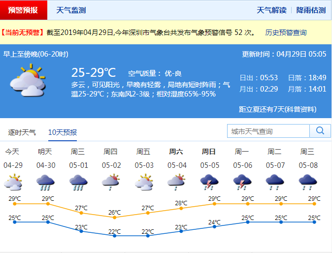 市氣象臺(tái)預(yù)測(cè),“五一”假期其余時(shí)間(2-4日)多云為主,可見(jiàn)陽(yáng)光,間中有短時(shí)陣雨,其中2-3日沿海和高地東風(fēng)強(qiáng)勁,最大陣風(fēng)8級(jí)左右。市氣象臺(tái)提醒市民,深圳已進(jìn)入強(qiáng)對(duì)流天氣多發(fā)期,需留意最新預(yù)警預(yù)報(bào)信息,注意提前防范局地短時(shí)強(qiáng)降雨、雷雨大風(fēng)和冰雹造成的災(zāi)害,遠(yuǎn)離戶(hù)外廣告牌、臨時(shí)建筑、低洼地和涵洞等排水不暢地區(qū)。