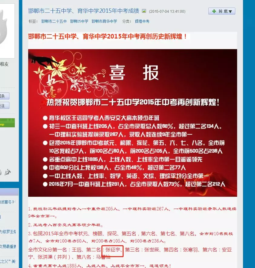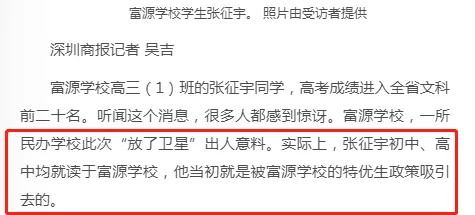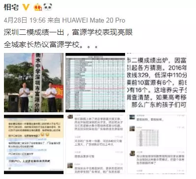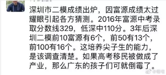近日,深圳高三二模成績出爐,一所學校引起了深圳家長圈的高度關注。 有網(wǎng)友在微博上報料富源學校表現(xiàn)亮眼,一石激起千層浪,事件是怎么一回事呢?一起來看看 2019深二模各校尖子生成績 其中民辦學校寶安區(qū)富源學校異軍突起,尖子生占比遠超深圳最好的四大高中(深圳中學,深圳實驗中學,深圳外國語學校,深圳高級中學),引人注目。 網(wǎng)友議論紛紛 網(wǎng)友@相宅稱:深圳富源中學,18年考中清北的學生名單和初中來源統(tǒng)計,經(jīng)過人肉搜索和大數(shù)據(jù)比對,確認相關證據(jù),有非常大的高考移民嫌疑。廣東高考本來就難,名校指標更少,還來擠占惹起公憤。同時附上19年深圳高考二模的富源成績。今年還有沒有高考移民,還會不會擠占廣東的名校指標? 針對網(wǎng)上的報料和家長的質疑,深圳教育局@深圳教育回應稱 情況說明 #情況說明#昨日,有部分家長對富源學校學生參加高考的資格提出疑問,我局高度重視,立即啟動調(diào)查。經(jīng)核實,富源學校在我市申請高考報名的學生均符合廣東省高考報名資格。根據(jù)《關于做好廣東省2019年普通高校招生統(tǒng)一考試報名工作的通知》(粵招〔2018〕15號)文件精神,廣東省戶籍學生可在廣東省內(nèi)報名參加高考;如果為非廣東戶籍,考生(家長)必須具備“兩個合法”、“三個三年”的條件,即具備合法穩(wěn)定職業(yè)、合法穩(wěn)定住所以及學籍、社保、居住證各滿三年。根據(jù)廣東省高考報名的政策規(guī)定,我市招考部門對所有報名考生的資格進行了嚴格審核。富源學校學生(包括戶籍在廣東省內(nèi)深圳市外的)均提供了戶籍所在地公安部門及我市學籍管理部門對其戶籍、學籍的審核證明,手續(xù)齊全、資料完整,符合在深圳參加高考的報名條件。 深圳市教育局一直嚴格執(zhí)行國家高考政策,嚴格高考報名資格審查。目前,正值考生進入高考緊張復習階段,我局呼吁大家關心每一位即將參加高考的孩子,共同營造良好的考前氛圍。 回應之下,小編根據(jù)現(xiàn)有的資料,發(fā)現(xiàn)了這些信息出入,一起接著往下看! 對比:富源學校深圳一模成績 成績單顯示,在前十名單里,富源學校獨占6位,而深圳四大公辦重點高中總和也只有4位,這是什么情況?對照看一看一模成績: 三年來深圳中考錄取情況: 富源學校可見生源不占優(yōu)勢 再來看一看三年來深圳中考錄取情況:富源學??梢娚床]有什么優(yōu)勢,總分460分的錄取分數(shù)比四大重點低了將近100分,但也不能因此說明該學校沒有尖子生源。 2018年富源學校高考清北名單:9位同學上清北 下圖是2018年幾所大學在廣東(理科)招生計劃: 但是,這幾名考進清北的同學,名字竟然出現(xiàn)在兩所不同的高中??? 考進廣東前20名的張征宇同學 網(wǎng)友爆料稱,深圳富源中學2018年高考喜報,特別宣傳了張征宇同學(后成功考入清華大學)。而他也出現(xiàn)在2015年的邯鄲市育華中學中考喜報上。乾坤大挪移,坐地日行八萬里! 家長質疑:富源中學光榮榜的同學 怎么又出現(xiàn)在衡水中學喜報上? 針對上面9位同學,搜索信息顯示,竟然有五位同學來自有名的高考大省河北。 在2018年的第31和32屆化學奧林匹克競賽的名單上,有一個共同的名字:崔一龍,但他們來自不同的學校。高二時他在衡水第一中學,高三他出現(xiàn)在深圳富源中學。 同時,該網(wǎng)友還發(fā)了一封 #一位深圳中學生家長寫給教育部的控訴信# 尊敬的國家教育部領導: 您好! 我是深圳市一名中學生的家長。這幾日網(wǎng)上流傳出一份深圳市高三年級第二次模擬考試前幾名學校分布成績單,其中民辦學校寶安區(qū)富源學校異軍突起,遠超深圳最好的四大高中(深圳中學,深圳實驗中學,深圳外國語學校,深圳高級中學)引起廣大家長的關注。隨后網(wǎng)上流傳出是富源學校與河北衡水中學之間的高考移民消息,具體操作是通過將河北衡水中學的尖子生戶口轉移到深圳富源學校,平時在衡水中學上課,考試在深圳富源學校,并參加深圳市高考。此情況幾年前已有,數(shù)量沒有那么大。今年突然大量此類考生出現(xiàn),大家猜測,如果不加管控未來必將愈演愈烈。 作為一名普通深圳市民和學生家長,我守法遵紀,但是實在難以接受這樣的現(xiàn)實。希望教育部能夠徹查此事,查明真相,還廣大家長和考生一個公道。 記者調(diào)查 網(wǎng)上傳出深圳高三二模數(shù)據(jù)圖,記者向深圳某中學老師證實了該表格的真實性。從數(shù)據(jù)中可看到,深圳二模全市前十共有11名,其中富源6名,深圳中學3名,深圳實驗學校和市高級中學各占1名。有家長質疑這是富源學校從衡水中學引入了高考移民,才導致二模成績一下子拔尖,并已申請要求有關部門徹查。 同時,小編梳理去年的報道發(fā)現(xiàn),張征宇同學此前的采訪顯示:張征宇初中、高中均就讀于富源學校,他當初就是被富源學校的特優(yōu)生政策吸引去的。 但是記者調(diào)查發(fā)現(xiàn),張征宇同學的名字出現(xiàn)在邯鄲市2015年中考喜報上。 此外,網(wǎng)上現(xiàn)正流傳富源模式:一方面從衡水挖學生過來利用深圳入戶容易這一點搞成深戶,在深圳高考,另一方面招深圳的孩子,學籍掛在深圳,送去衡水上課,再回深圳高考。 【這四大謎團仍待解】 盡管教育部門通報稱,經(jīng)核實,富源學校在深圳申請高考報名的學生