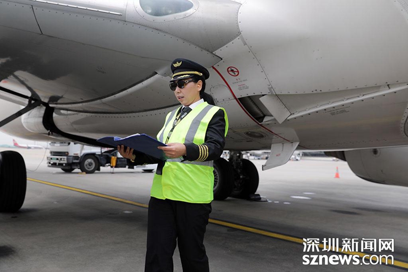 上午8時(shí),航班起飛前,飛行員崔陽(yáng)按程序開(kāi)展航前飛機(jī)檢查工作(涂勝 攝)