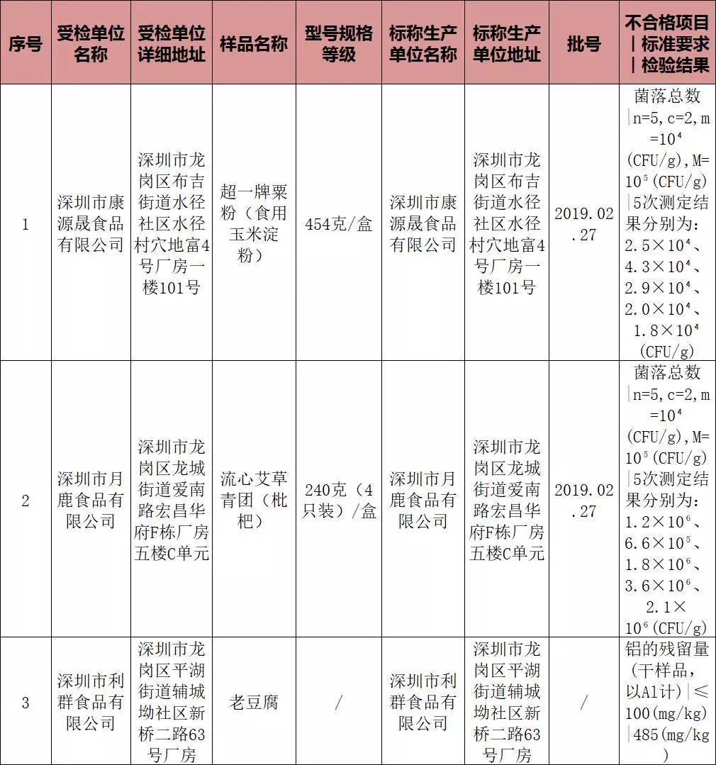 另有1批次食用玉米淀粉和1批次流心艾草青團(tuán)皆被檢出菌落總數(shù)超標(biāo),它們的受檢單位依次是深圳市康源晟食品有限公司和深圳市月鹿食品有限公司。