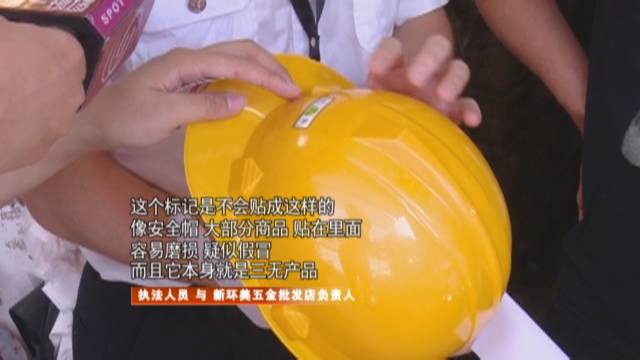 在新環(huán)美五金批發(fā)店,銷(xiāo)售的所有安全帽,除了寫(xiě)有一個(gè)“安鑒”的字樣外,就再?zèng)]有任何標(biāo)識(shí),而且“安鑒”標(biāo)志粘貼也不符合規(guī)范,明顯也屬于三無(wú)產(chǎn)品。