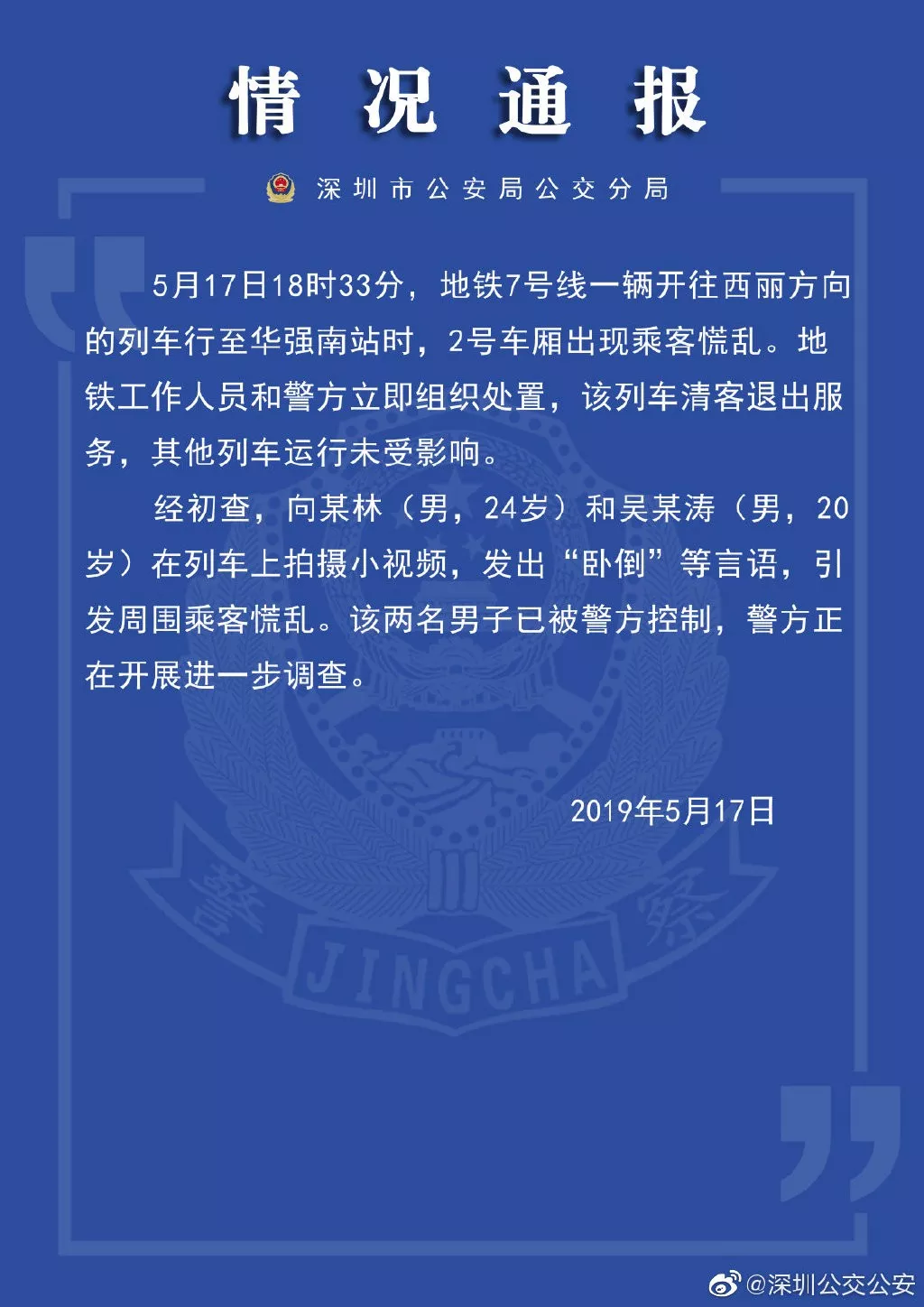 據(jù)深圳公交公安介紹,5月17日18時(shí)33分,地鐵7號(hào)線一輛開往西麗方向的列車行至華強(qiáng)南站時(shí),2號(hào)車廂出現(xiàn)乘客慌亂。地鐵工作人員和警方立即組織處置,該列車清客退出服務(wù),其他列車運(yùn)行未受影響。