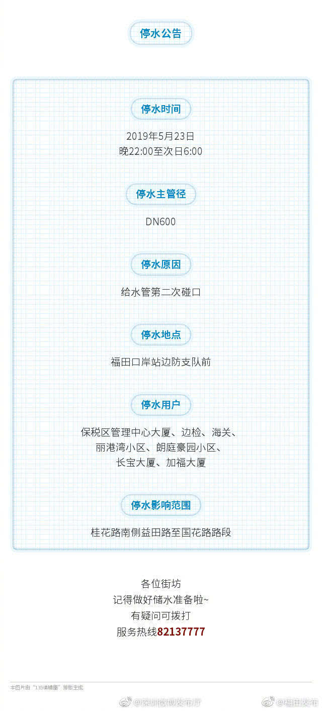 溫馨提醒!今天晚上22:00至明日6:00,福田區(qū)保稅區(qū)管理中心大廈、邊檢、海關、麗港灣小區(qū)、朗庭豪園小區(qū)、長寶大廈、加福大廈等區(qū)域?qū)⒂媱澩K?,各位街坊記得做好儲水準備啊!戳下圖了解更多停水停電資訊!