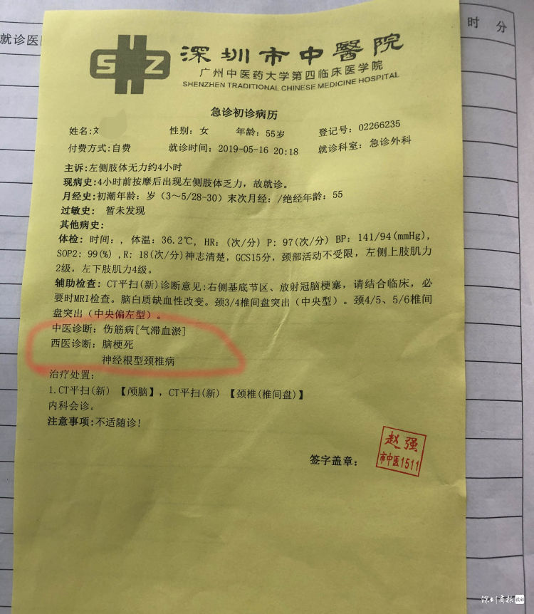 劉女士感到身體不適后要求送醫(yī)檢查,店家則找來里其他"師傅",繼續(xù)進(jìn)行3個(gè)多小時(shí)的按摩、艾灸……"耽誤了我母親的最佳搶救時(shí)間。后來是我到了,強(qiáng)烈要求送醫(yī)院,他們才帶著我母親去中醫(yī)院就診,診斷是急性腦梗死。"劉女士女兒李小姐告訴記者,店家在發(fā)生3小時(shí)后才將其母親目前送醫(yī)院救治,醫(yī)生告訴她錯(cuò)過了最佳救治時(shí)間。
