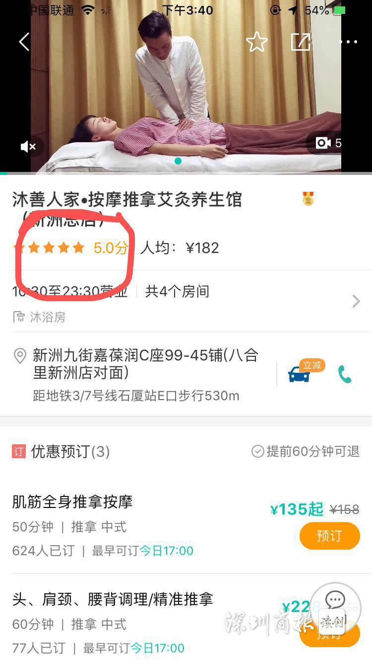 5月16日,55歲的劉女士通過美團(tuán)點(diǎn)評(píng)查詢,發(fā)現(xiàn)一家五星"足療按摩人氣商戶"。下午3時(shí)許,劉女士來到深圳市福田區(qū)沐善人家按摩艾灸養(yǎng)生館新洲店進(jìn)行按摩。