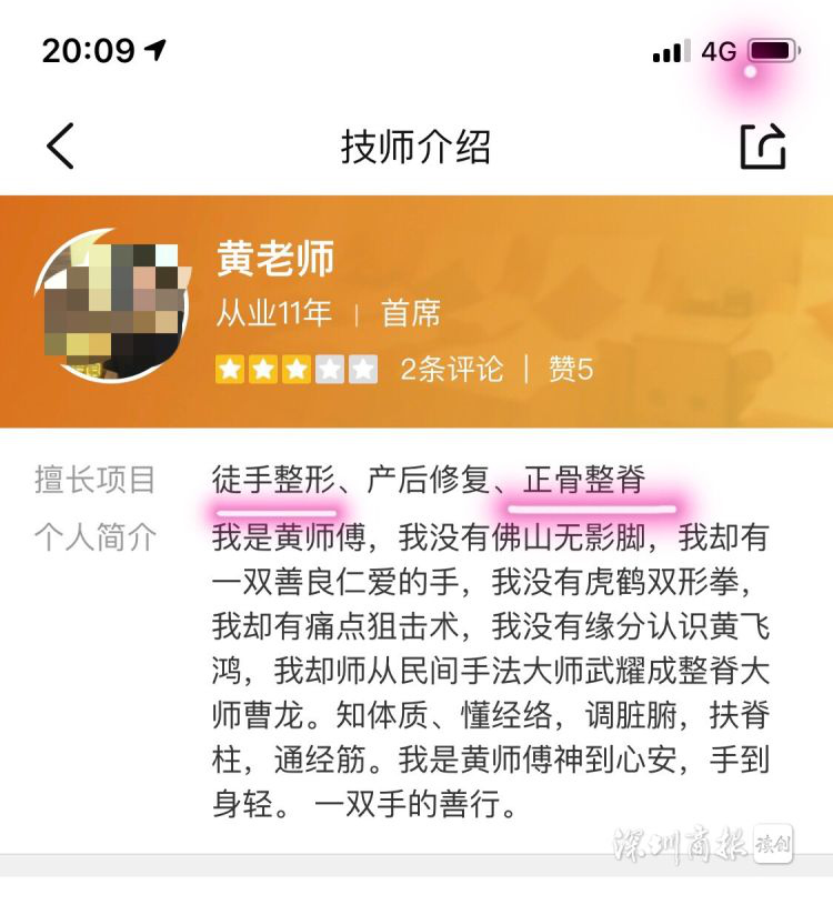 涉事黃師傅在美團(tuán)上介紹顯示為首席技師,其從業(yè)11年,擅長(zhǎng)項(xiàng)目為徒手整形、產(chǎn)后修復(fù)、正骨整脊。值得注意的是,該店在美團(tuán)上評(píng)價(jià)為五星滿分。