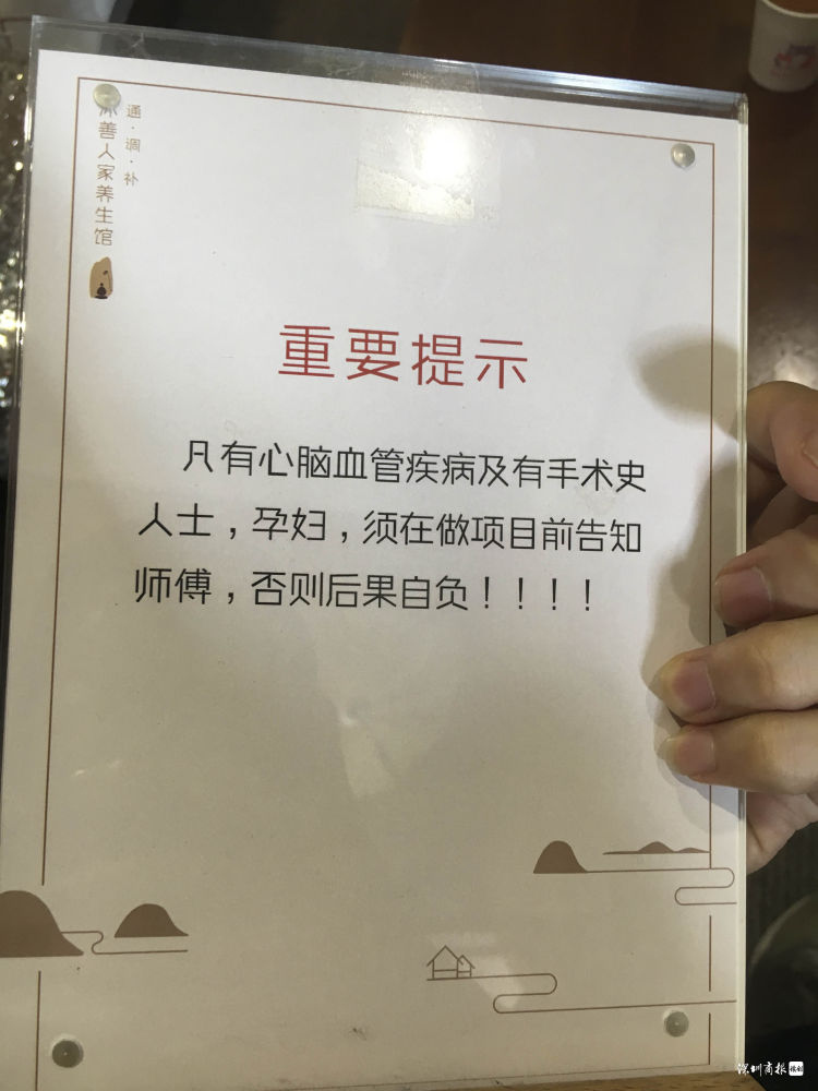 5月22日,讀創(chuàng) /深圳商報(bào)記者來到了該養(yǎng)生館,該養(yǎng)生館仍在正常營(yíng)業(yè)。記者發(fā)現(xiàn),店家在桌子上擺放了重要提示:凡有心腦血管疾病及有手術(shù)史人士、孕婦,須在做項(xiàng)目前告知師傅,否則后果自負(fù)!李小姐告訴記者,這是她母親出事后才增加的,正骨等項(xiàng)目已被店家從美團(tuán)上撤下。