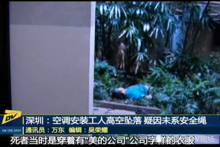 從拍攝的視頻可以看到,死者當(dāng)時是穿著有"美的公司"公司字樣的衣服,目擊者說,死者是在13樓安裝空調(diào)外機時出事的。