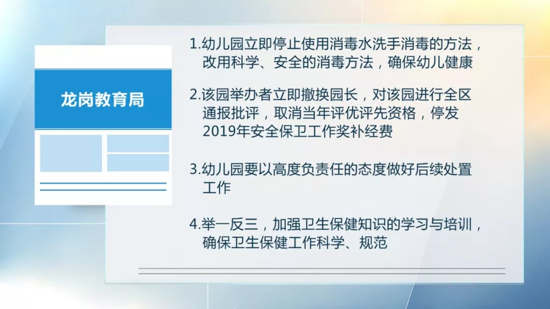 5月24日,龍崗區(qū)教育局了解到該情況后,立即派工作人員到幼兒園進行調(diào)查。經(jīng)查,該園出現(xiàn)“皰疹性咽頰炎”后,違規(guī)使用強力消毒粉兌水給幼兒洗手消毒,存在衛(wèi)生保健上嚴重錯誤。