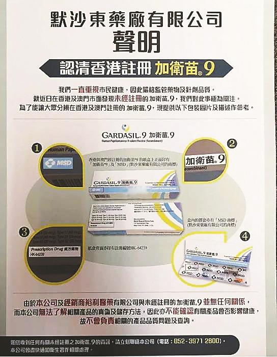 早前,HPV(全稱(chēng)人乳頭狀瘤病毒)九價(jià)疫苗生產(chǎn)商默沙東藥廠曾發(fā)出聲明,把其公司指定的代理商,從未供應(yīng)任何“HPV九價(jià)預(yù)防疫苗”(GARDASIL9加衛(wèi)苗9)予位于佐敦嘉賓商業(yè)大廈的環(huán)亞體檢集團(tuán)(最早被投訴給內(nèi)地客人打水貨疫苗的公司)。
