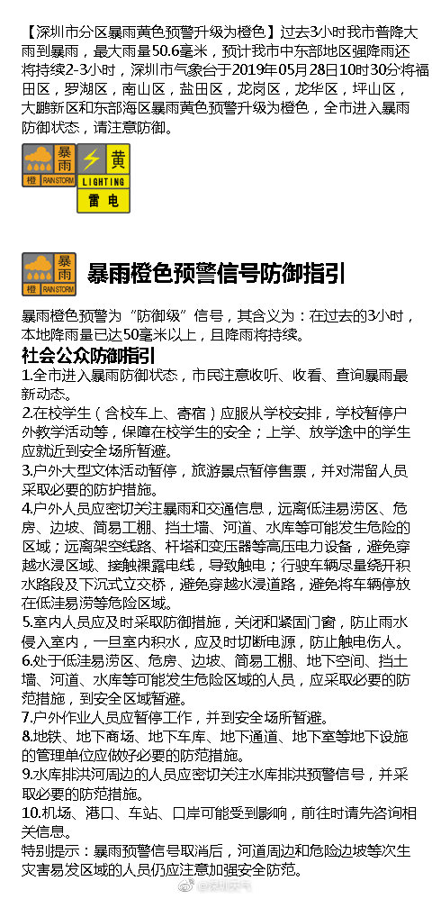 【三防信息】市氣象局已于5月28日10時30分在發(fā)布暴雨橙色分區(qū)預(yù)警信號。目前降雨持續(xù),局部地區(qū)雨勢較大,為切實做好全市各項防御工作,及時應(yīng)對險情災(zāi)情,根據(jù)《深圳市防汛應(yīng)急預(yù)案》,市三防指揮部決定于5月28日10時30分啟動防汛Ⅳ級應(yīng)急響應(yīng)。