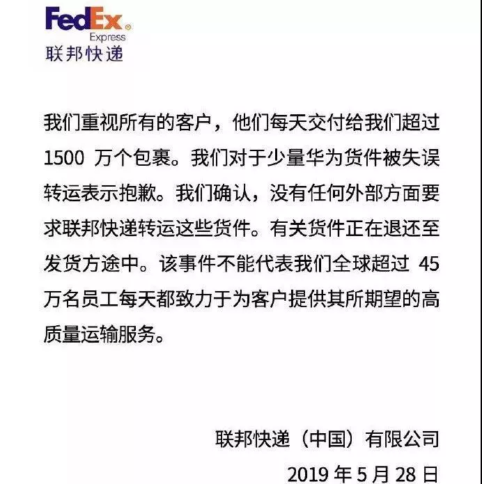聯(lián)邦快遞承認“失誤”轉(zhuǎn)運并表示抱歉