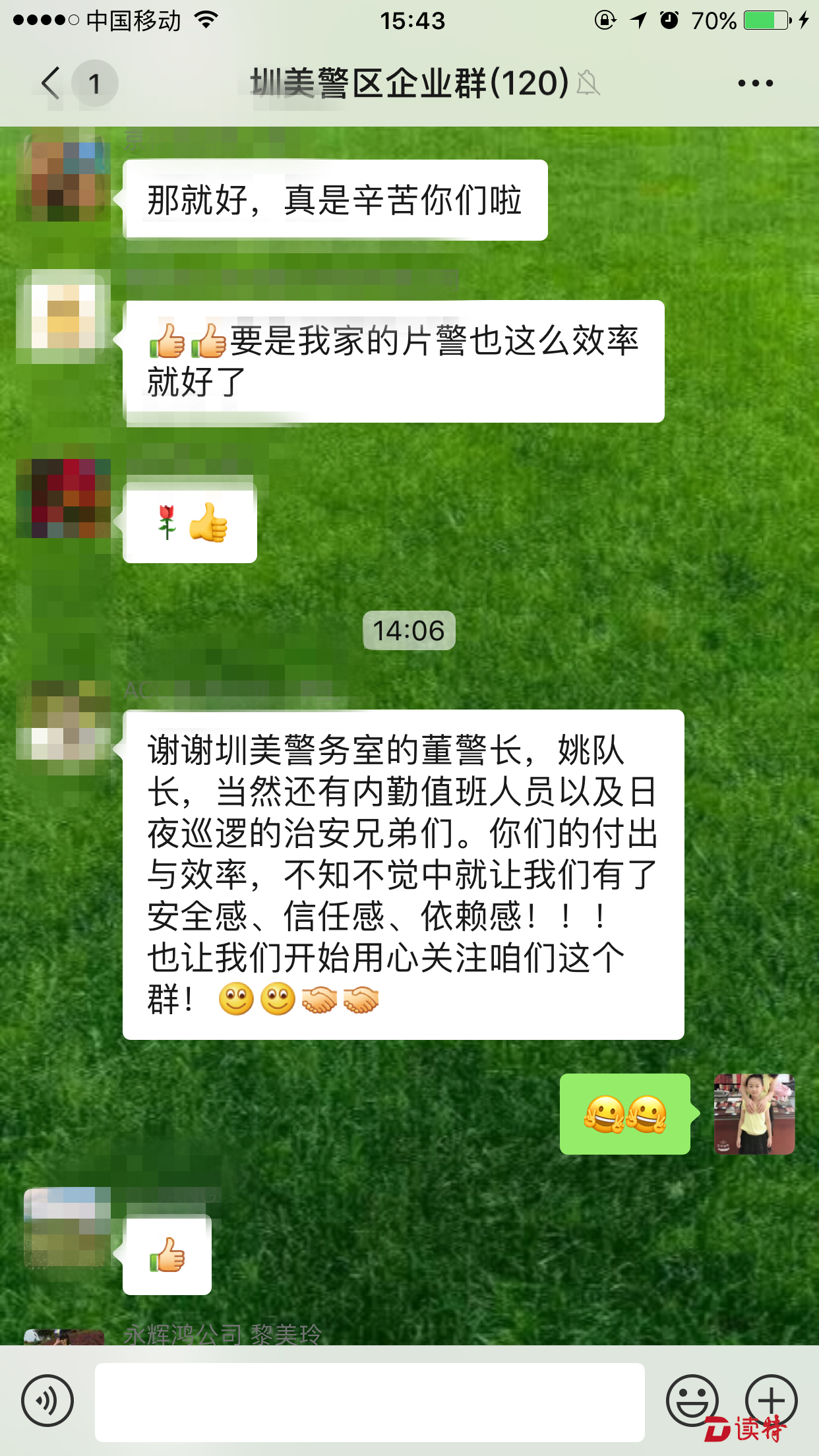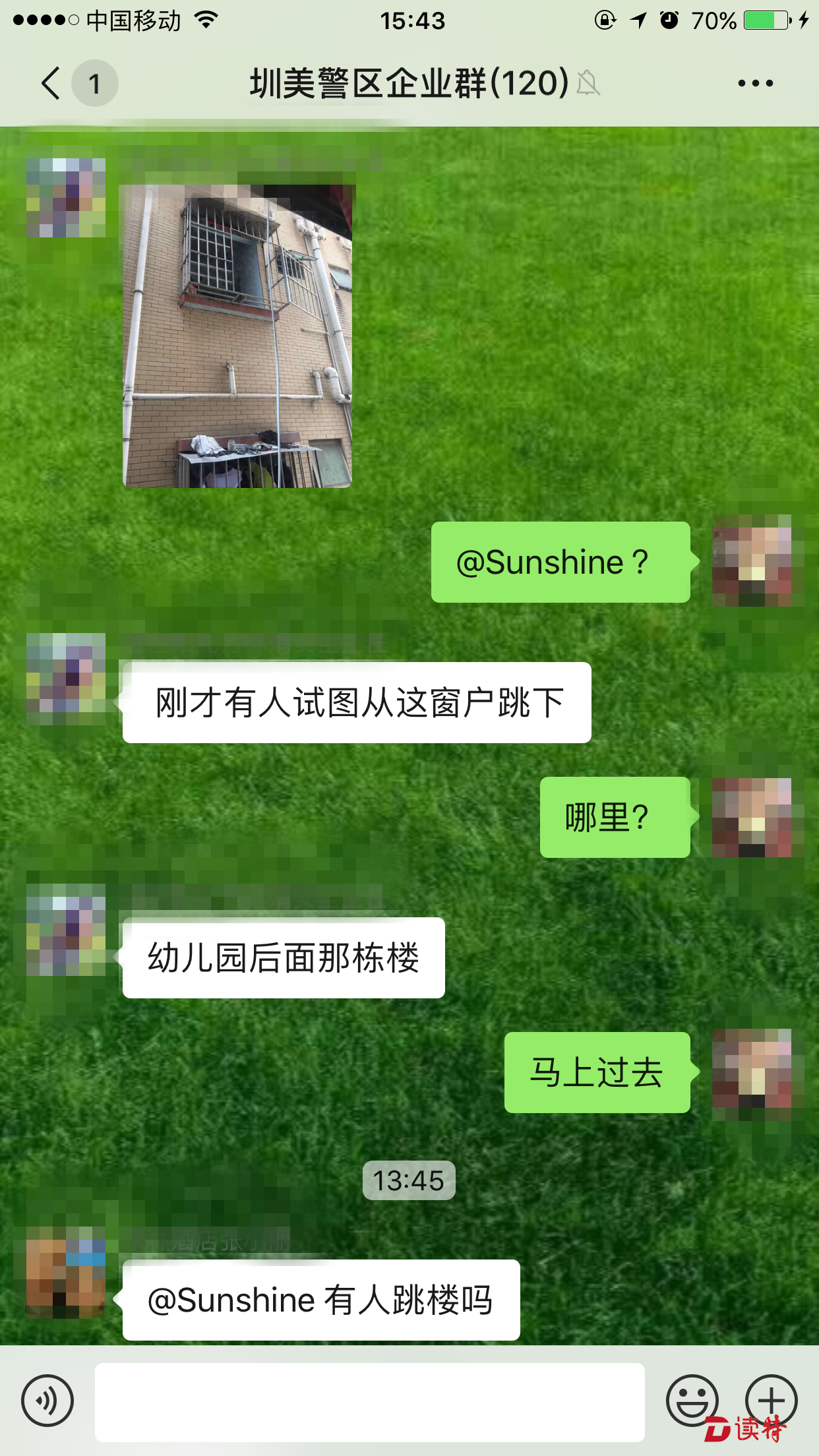 就在圳美警區(qū)隊員現(xiàn)場處置的過程中,微信群中的成員紛紛詢問事件情況。在了解到圳美警務(wù)室的隊員不到1分鐘就趕到現(xiàn)場后,大家對警區(qū)工作人員接連點贊。(讀特記者 王茂程 通訊員 胡澤瑜 溫小龍)