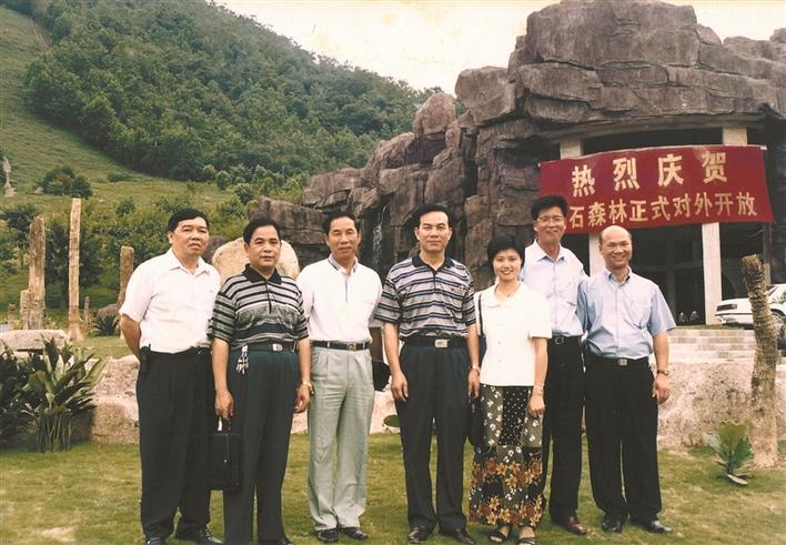 ▲1999年,仙湖植物園化石森林景區(qū)正式對(duì)外開(kāi)放,陳譚清(右二)與同事在景區(qū)前合影。