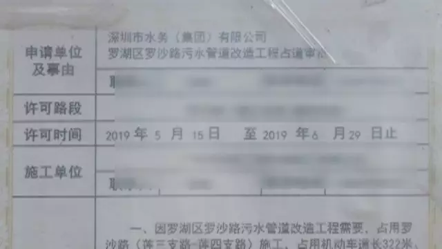 現(xiàn)場的一份施工告知書顯示,正在施工的這項工程,屬于水務集團羅沙路污水管道改造工程,獲得了占用道路挖掘許可。工程周期從5月15日開始到6月29日截止,一共45天。