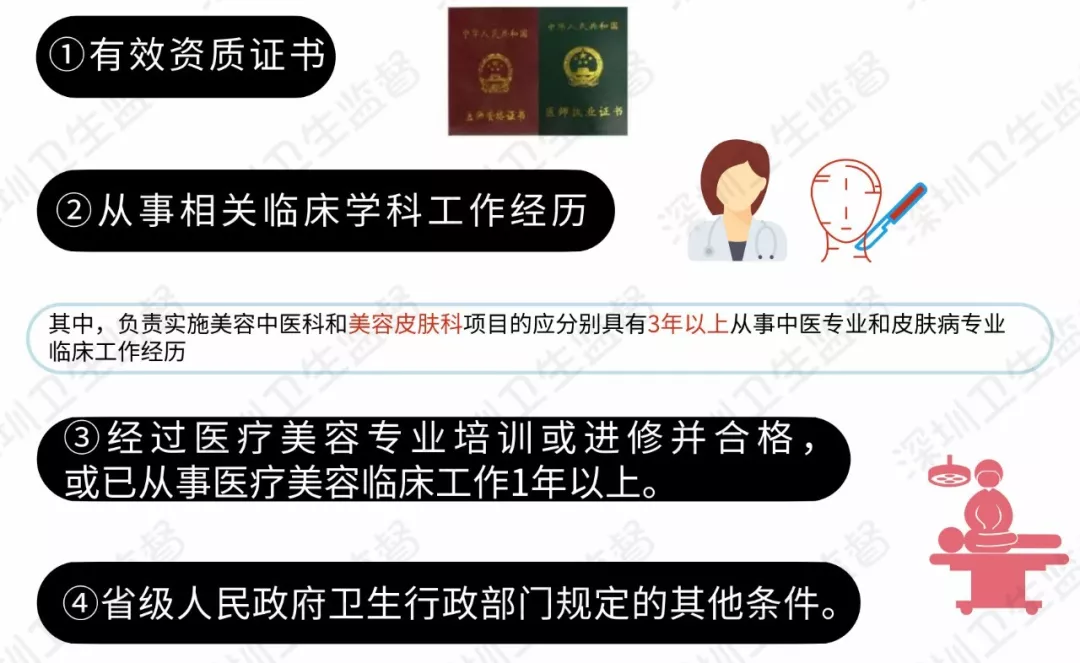 (二)具有從事相關(guān)臨床學(xué)科工作經(jīng)歷。其中,負(fù)責(zé)實(shí)施美容外科項(xiàng)目的應(yīng)具有6年以上從事美容外科或整形外科等相關(guān)專業(yè)臨床工作經(jīng)歷;負(fù)責(zé)實(shí)施美容牙科項(xiàng)目的應(yīng)具有5年以上從事美容牙科或口腔科專業(yè)臨床工作經(jīng)歷;負(fù)責(zé)實(shí)施美容中醫(yī)科和美容皮膚科項(xiàng)目的應(yīng)分別具有3年以上從事中醫(yī)專業(yè)和皮膚病專業(yè)臨床工作經(jīng)歷;(三)經(jīng)過(guò)醫(yī)療美容專業(yè)培訓(xùn)或進(jìn)修并合格,或已從事醫(yī)療美容臨床工作1年以上;(四)省級(jí)人民政府衛(wèi)生行政部門規(guī)定的其他條件。