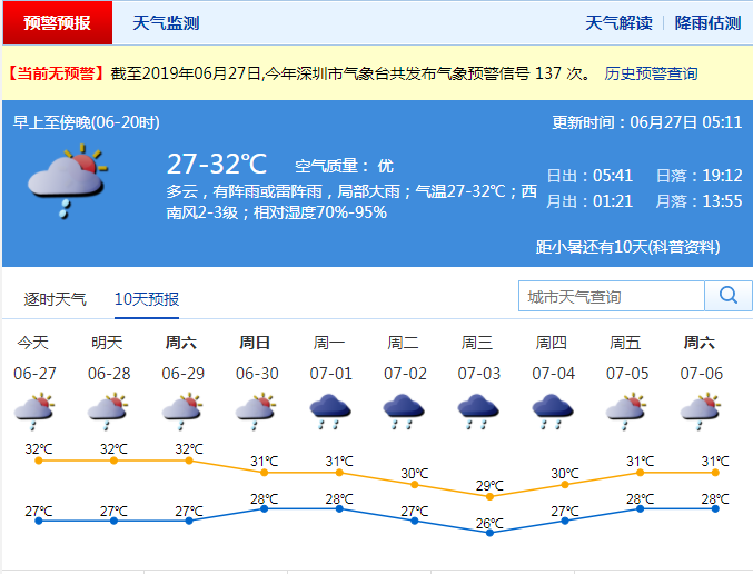 深圳新聞網(wǎng)2019年6月27日訊 昨天下午持續(xù)多日的陰雨天氣也趨于結(jié)束,但隨著降雨減弱,陽光重現(xiàn),氣溫也隨之回升。預(yù)計27-29日多云,有陣雨或雷陣雨,部分時間雨勢較大;30日至7月1日仍有陣雨或雷雨;未來4-5天降雨總體陽光陣雨相伴,天氣趨于炎熱。
