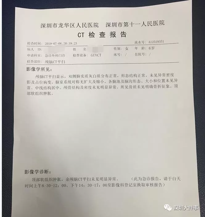 據市民李女士報料稱,7月6日晚上8時許,在龍華區(qū)弓村一巷一位6歲女童被樓上掉下的瓶子砸中頭部,血流不止。隨后女童被父母送往附近社康醫(yī)治,但因傷口太深社康無法治療,遂被送往龍華人民醫(yī)院救治。