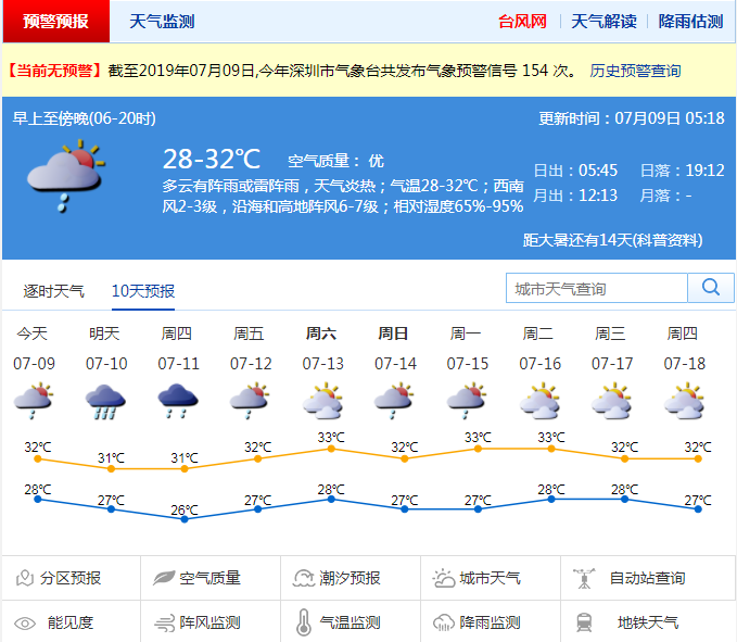 深圳新聞網(wǎng)2019年7月9日訊 近幾天,深圳天氣炎熱,有短時陣雨,白天最高氣溫達到31~33 ℃。預計9日有陣雨或雷陣雨,10~11日將有一次中到大雨局部暴雨過程,伴有雷暴和7~8級短時大風,炎熱天氣將有所緩解。