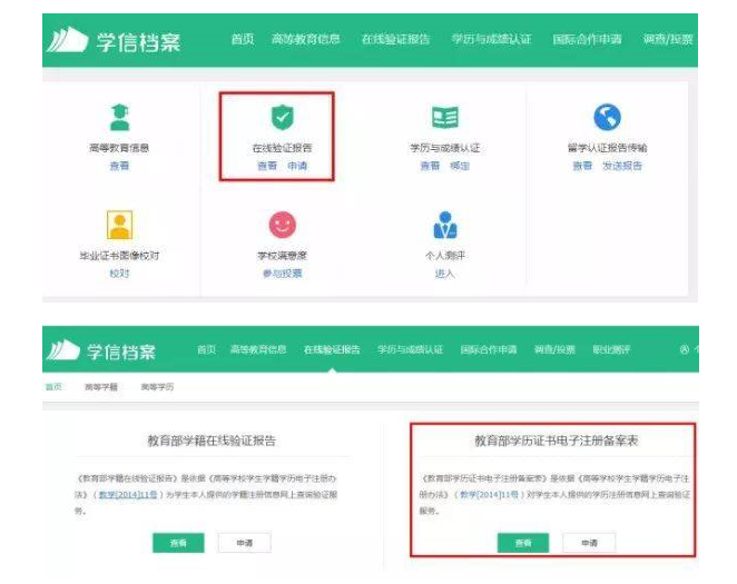 登錄之后,點擊“申請在線驗證報告”,選擇查看《教育部學(xué)歷證書電子注冊備案表》。