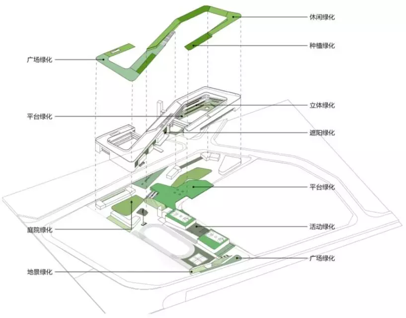 龍華區(qū)行知學(xué)校用地被西側(cè)的城市綠地、東南角的獅徑公園所包裹,具備天然的景觀優(yōu)勢(shì)。在內(nèi)部布局中,將場(chǎng)地、屋頂、架空層、立面結(jié)合起來,賦予多層次的綠化空間,打造真正的綠色校園。