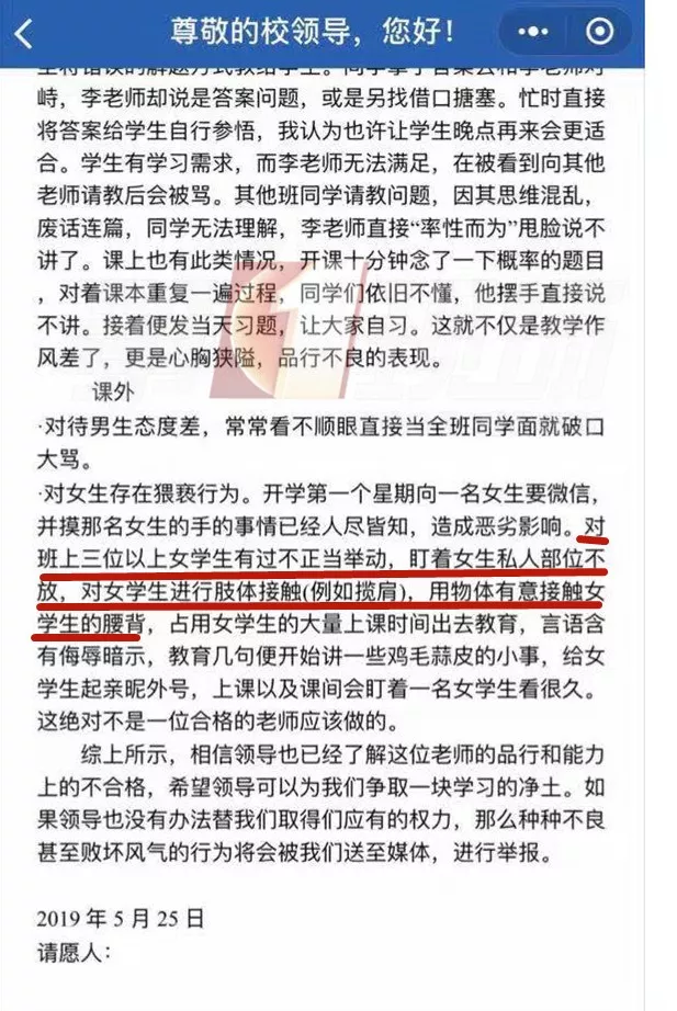 李先生向記者提供了一份,據(jù)稱是學(xué)生寫的聯(lián)名信,關(guān)于這位老師的不當(dāng)品行,其中寫道“對(duì)班上三位以上女學(xué)生有過(guò)不正當(dāng)舉動(dòng),盯著女生私人部位不放,對(duì)女學(xué)生進(jìn)行肢體接觸,例如攬肩,用物體有意接觸女學(xué)生的腰背,給女生起親昵外號(hào)”。