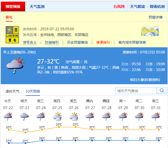 深圳新聞網(wǎng)2019年7月22日訊 炎熱與局地陣雨是近日深圳天氣的主題。據(jù)市氣象局預(yù)計,未來兩天我市依然陽光陣雨相伴,部分時間雨勢較大。其中,22日多云,有(雷)陣雨,局部大雨;27-32℃;西南風2-3級;濕度65%-95%。預(yù)計23-24日有(雷)陣雨,局部大雨;25-26日天氣炎熱,有局地短時陣雨。