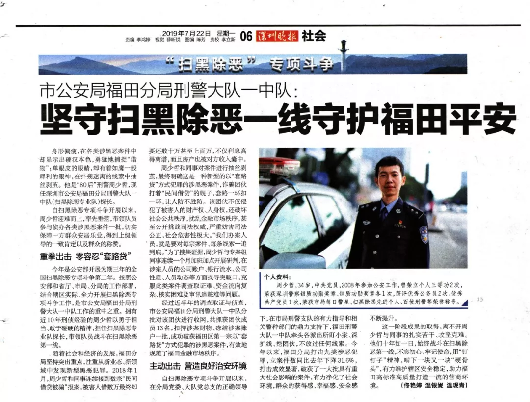 今年是公安部開展為期三年的全國掃黑除惡專項斗爭的第二年。按照公安部和省廳、市局、分局的工作部署,結(jié)合轄區(qū)實際,全力開展掃黑除惡專項斗爭工作,是市公安局福田分局刑警大隊一中隊工作的重中之重。擁有近10年刑偵經(jīng)驗的周少哲以勇于擔(dān)當(dāng)、敢于碰硬的精神,擔(dān)任掃黑除惡專業(yè)隊探長,帶領(lǐng)隊員戰(zhàn)斗在掃黑除惡第一線。