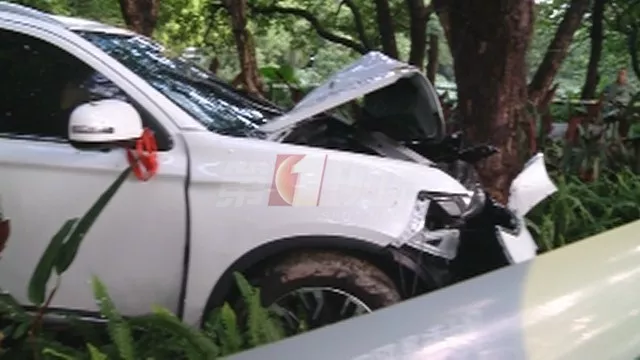 事情發(fā)生在7月21日下午3點50分,在事發(fā)現(xiàn)場可以看到一輛白色三菱汽車撞到了一棵樹,車頭被撞得完全凹陷,支離破碎。