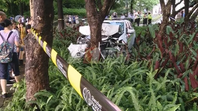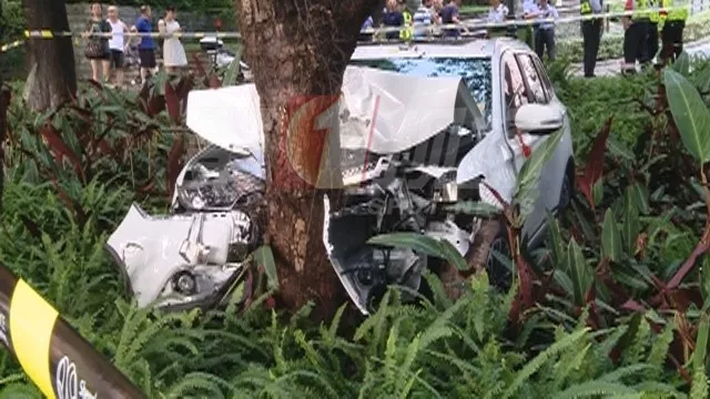據(jù)現(xiàn)場目擊者稱當(dāng)時車輛直接碾過人行綠道并撞飛了兩個小孩,最終車頭撞向荷花塘邊的一棵大樹才停住,如果不是這棵大樹阻擋,這輛車很有可能會沖向荷花塘里。