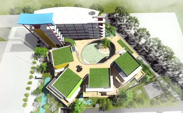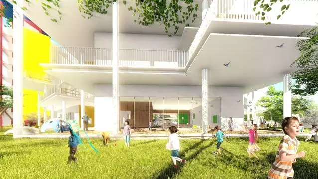 項(xiàng)目打破傳統(tǒng)整齊排列的布局方式,打造出4個與邊界呼應(yīng)的靈活體塊,在保證幼兒園首層活動空間完整最大化的同時,將新舊校舍結(jié)合,打造一個聯(lián)通式共享庭院。新建校舍為每一個班級都提供了專屬的室內(nèi)外無邊界活動空間。除首層班級與室外活動空間直接連通以外,二、三層班級外設(shè)有錯落的活動露臺及挑檐,實(shí)現(xiàn)每層均可嬉戲、游樂、探索的布局。
