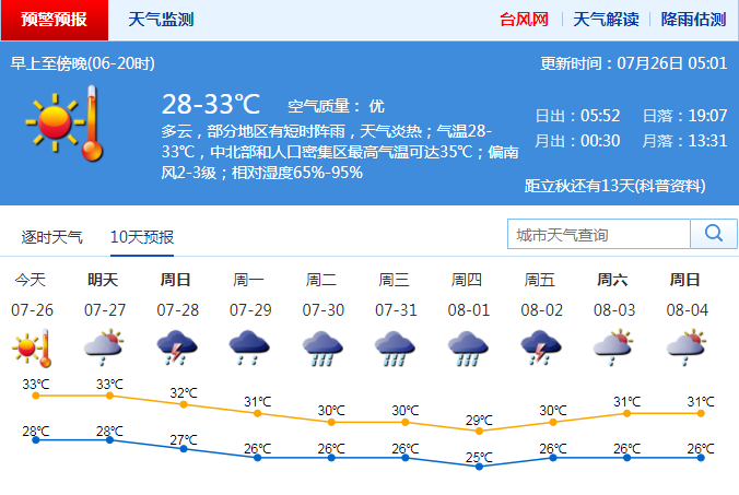 記者從市氣象臺獲悉,受副熱帶高壓影響,26日多云,局部有短時陣雨,氣溫28~33 ℃,局部最高35 ℃;27日多云,部分地區(qū)有短時陣雨或雷雨,天氣炎熱;28日有雷陣雨,伴有短時強降水和6~8級短時大風(fēng);29日有雷陣雨,局部大雨;30~31日有一次明顯降雨過程。