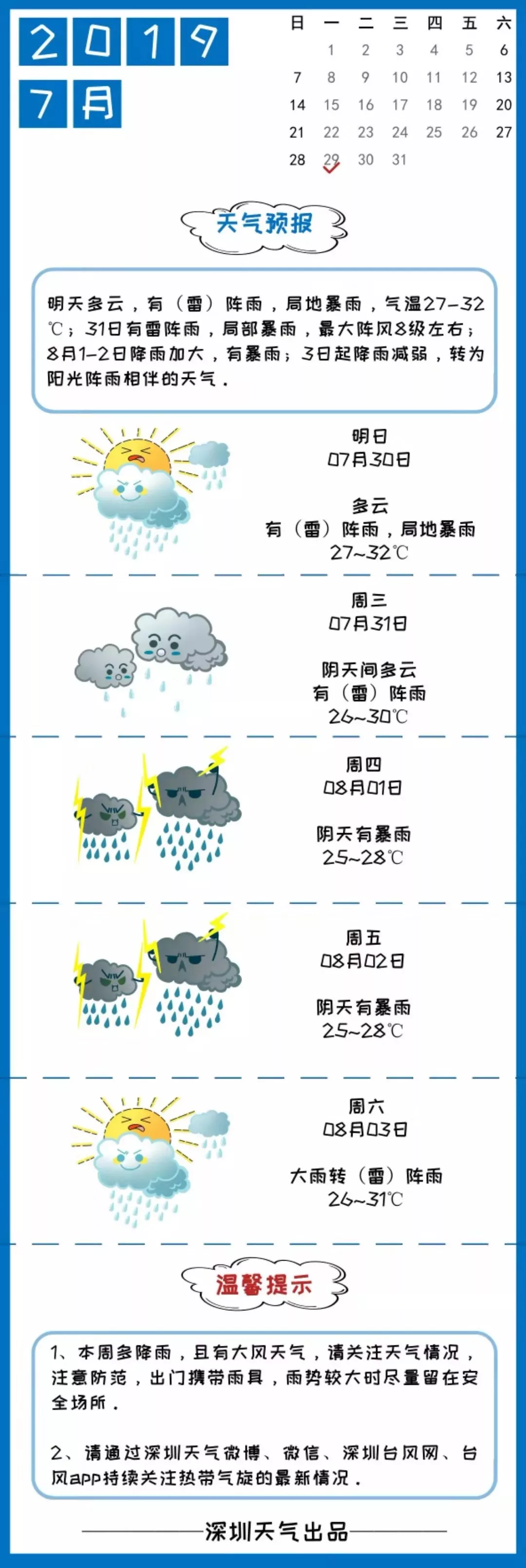目前臺(tái)風(fēng)還沒生成,不過不管登陸不登陸,它們將給廣東帶來“涼爽”東南風(fēng),近期炎熱的天氣也會(huì)在臺(tái)風(fēng)胚胎的活動(dòng)下稍有緩解,而據(jù)深圳市氣象局預(yù)計(jì)深圳本周多降雨,中后期降雨頻密。