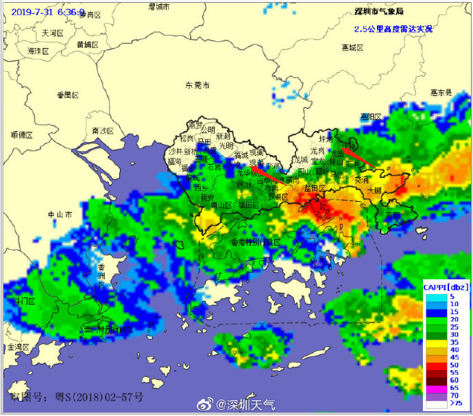 預(yù)計(jì)全市6小時(shí)內(nèi)將出現(xiàn)50毫米或以上降水,深圳市氣象臺(tái)于2019年07月31日06時(shí)30分在全市發(fā)布暴雨黃色分區(qū)預(yù)警,全市進(jìn)入暴雨戒備狀態(tài),請(qǐng)注意防范。
