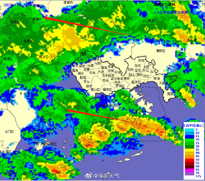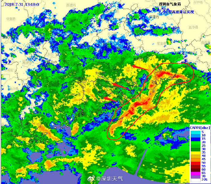 當(dāng)一條雨帶的長(zhǎng)軸和雨帶的移動(dòng)方向(箭頭)夾角很小時(shí),某個(gè)地方就會(huì)被這條雨帶幾乎從頭到尾地經(jīng)過(guò),于是這個(gè)地方的累計(jì)雨量就會(huì)特別大。而現(xiàn)在深圳靠南的大部分區(qū)域就在經(jīng)歷一場(chǎng)列車效應(yīng),所以這場(chǎng)雨持續(xù)時(shí)間比較長(zhǎng),短時(shí)間內(nèi)停不下來(lái)。