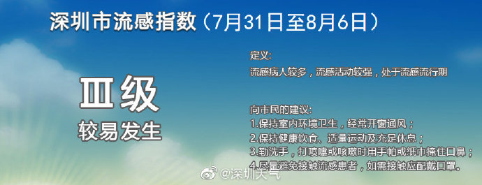 2019年7月31日至8月6日,深圳市流感指數(shù)為Ⅲ級(jí)(較易發(fā)生),未來(lái)一周本市處于流感流行期,流感活動(dòng)較強(qiáng),流感病人較多,提醒市民: