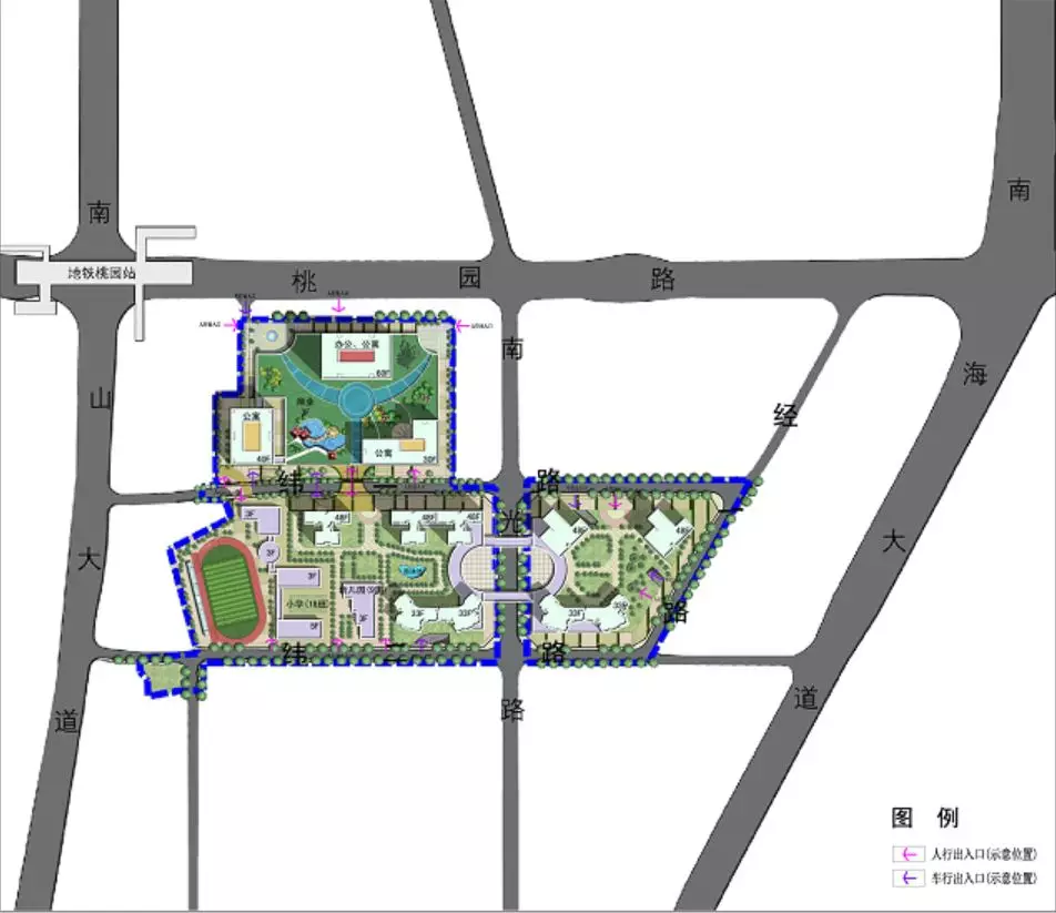 項目將采取TOD模式(以公共交通為導向的開發(fā)模式)開發(fā),計劃將居住、商業(yè)、辦公和公共空間解決在600米之內(nèi)的范圍。該項目由1棟60F寫字樓公寓、2棟30F-40F公寓、9棟33F-48F超高層住宅以及1所18班小學、1所9班幼兒園組成。