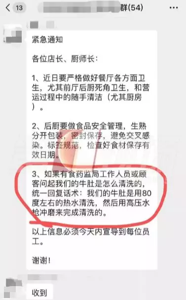 這張聊天截圖顯示:前晚7點(diǎn)54分,八合里的一個(gè)內(nèi)部群,發(fā)出了一則緊急通知,要求店長、廚師長近期要做好餐廳各方面衛(wèi)生,后廚要做好食品安全管理。如果有食藥監(jiān)局工作人員或顧客詢問,牛肚是怎么清洗的,統(tǒng)一回復(fù)的話術(shù)是:我們的牛肚是用80度左右的熱水清洗,然后用高壓水槍沖磨來完成清洗的。